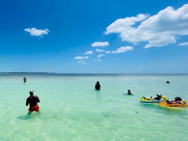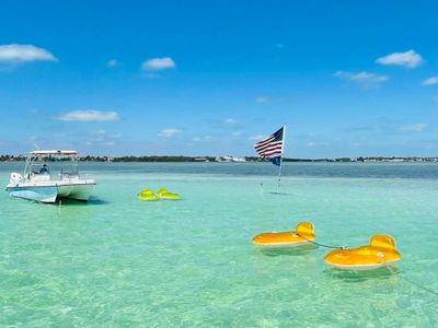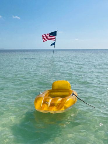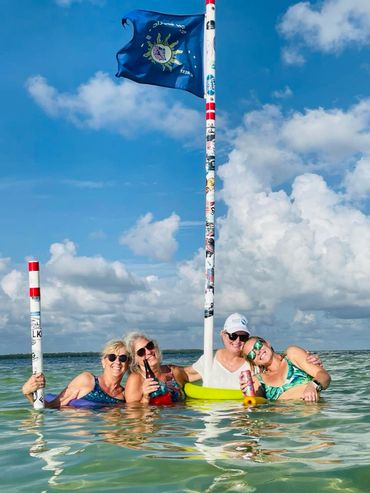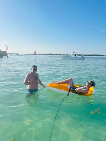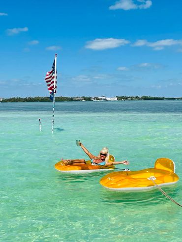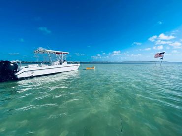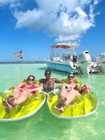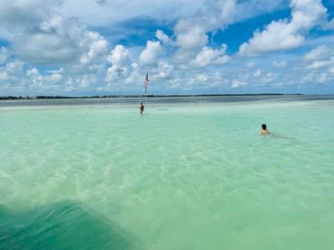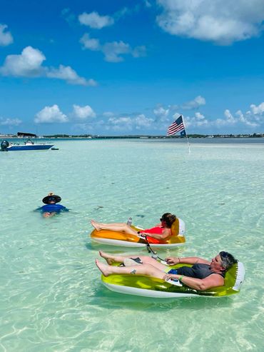 The Islamorada Sandbar is about a mile off shore and just a short 15 minute boat ride from our dock! On our Islamorada Sandbar Charters, you can hop off the boat into crystal clear waters only a few feet deep. Walk around or swim and relax in our floats with an icy cold beverage. Listen to some music through our JBL Bluetooth sound system on the boat! We have floats, toys and footballs for kids of all ages to enjoy. And our cooler is fully stocked with ice cold drinks to keep you hydrated. There is something for everyone on this private charter to the Islamorada Sandbar!